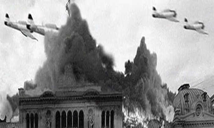 La primera bomba cayó a las 12.40 del mediodía sobre un trolebús de la línea 305 cargado de pasajeros, según nos cuenta Alejandro Covello en su libro Batallas aéreas. Como parte de la operación, iniciado el ataque de los aviones, el batallón 4 de infantería de Marina esperaba en Cangallo y Madero con intenciones de tomar la Casa de Gobierno.