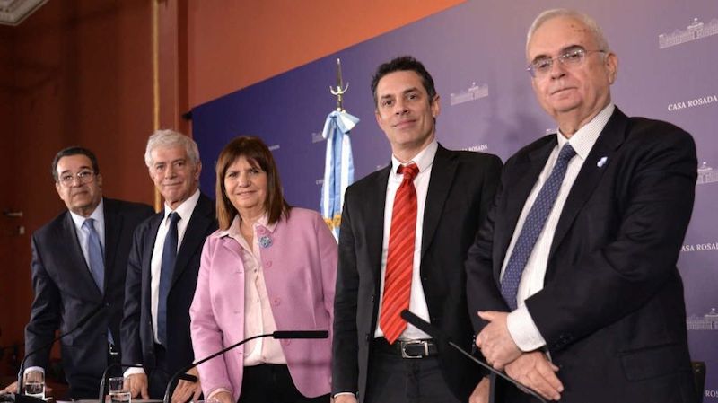 El ministro de Justicia, Mariano Cúneo Libarona y la ministra de Seguridad, Patricia Bullrich presentaron este miércoles en Casa Rosada el proyecto de juicio en ausencia para la causa AMIA.