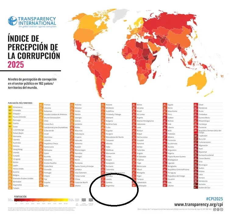 La Argentina registró un aumento de los casos de corrupción a lo largo de 2025, según lo indica mundial de transparencia elaborado por la organización no gubermental Transparency International, que muestra al país en el puesto 104, cuando en 2024 estaba en el puesto 99.