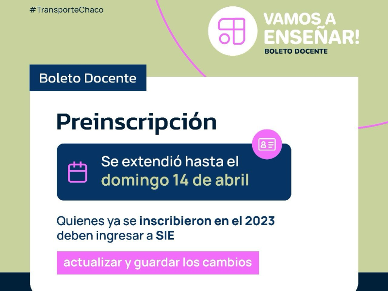 El Gobierno de la Provincia del Chaco, a través del Ministerio de de Infraestructura, Obras y Servicios Públicos y la Subsecretaría de Transporte y Logística junto al Ministerio de Educación, Cultura, Ciencia y Tecnología, comunica que se extenderá hasta el domingo 14 de abril la preinscripción online para acceder al Boleto Docente del Programa “Vamos a Enseñar “destinado a los trabajadores activos de todos los niveles y las modalidades, así como a los auxiliares docentes, que se trasladan en colectivo -de media distancia- de una localidad a otra dentro del territorio provincial para asistir a las escuelas.