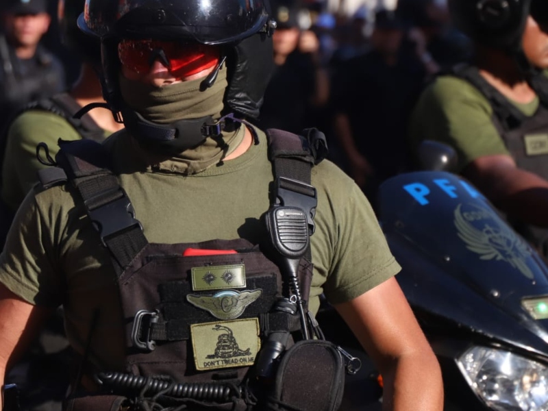 En el marco de la actuación policial, un agente apareció fotografiado con la llamada “Bandera de Gadsden”, que representa una serpiente enroscada acompañada por la leyenda “No me pises”, que se identifica con posturas ultraliberales.