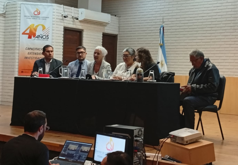 Este martes 29 de abril por la tarde se concretó en el Salón Auditorio del Centro de Estudios Judiciales (CEJ) la capacitación bimodal “Las culturas indígenas, la aplicación del derecho y el acceso a la justicia”. La actividad estuvo encabezada por la jueza del Superior Tribunal de Justicia e integrante de la Cátedra Libre de Derecho Indígena “Ricardo Altabe”, Iride Isabel María Grillo, quien estuvo acompañada por Elizabet González, coordinadora de los Pueblos Indígenas ante el Poder Judicial; Rosario Augé, secretaria coordinadora del CEJ; Gonzalo García Veritá, juez de Niñez, Adolescencia y Familia N° 1 de Castelli; Daniel Escalante, abogado de la Coordinación de Pueblos Indígenas; Mirtha Bejarano, secretaria relatora del Juzgado Multifueros de Misión Nueva Pompeya; el líder qom Alberto Nuñez; Coordinador del Parlamento indígena del Chaco, Gustavo Mendoza; joven lideresa, Aldana Martín González; Presidenta del Comité para la Prevención de la Tortura del Chaco, Bashe Charole, entre otros.