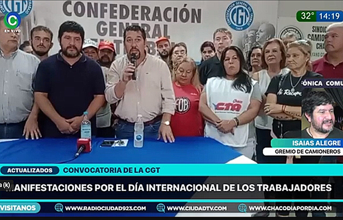 El secretario General de la delegación chaqueña de la CGT, Isaías Alegre, encabezó este martes, junto a su par, Adrián Bellomi, la conferencia de prensa que se realizó en la sede de la central obrera con referentes gremiales y de organizaciones de distintos sectores de trabajadores, previo a la movilización y acto de este 1° de Mayo.