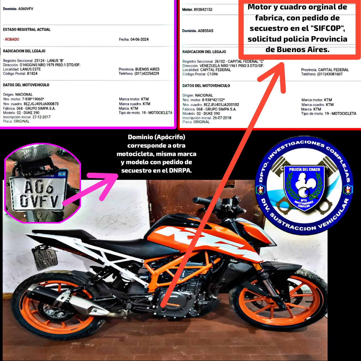 El operativo fue llevado a cabo por la División Sustracción Vehicular del Departamento de Investigaciones Complejas, quienes también descubrieron que la moto poseía documentos falsos y una patente apócrifa.