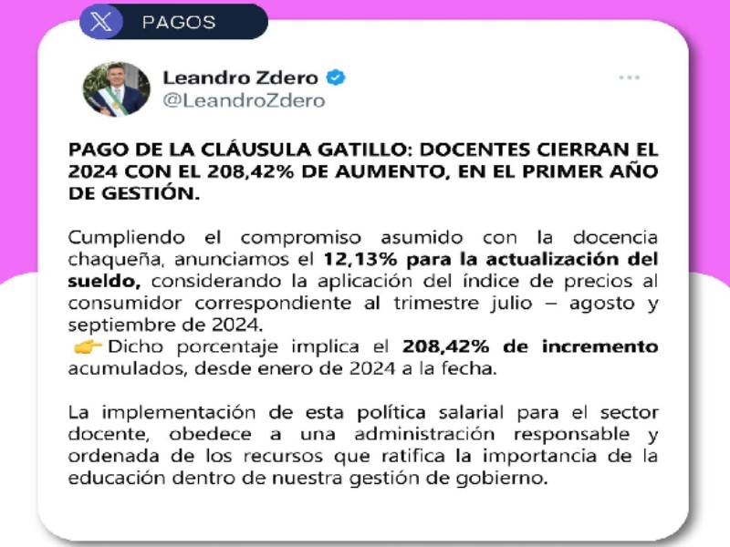 El gobernador Leandro Zdero anunció, esta mañana, el pago de la Cláusula Gatillo para el sector docente “Cumpliendo el compromiso asumido con la docencia chaqueña, anunciamos el 12,13% para la actualización del sueldo, considerando la aplicación del índice de precios al consumidor correspondiente al periodo julio- septiembre de 2024”, afirmó.