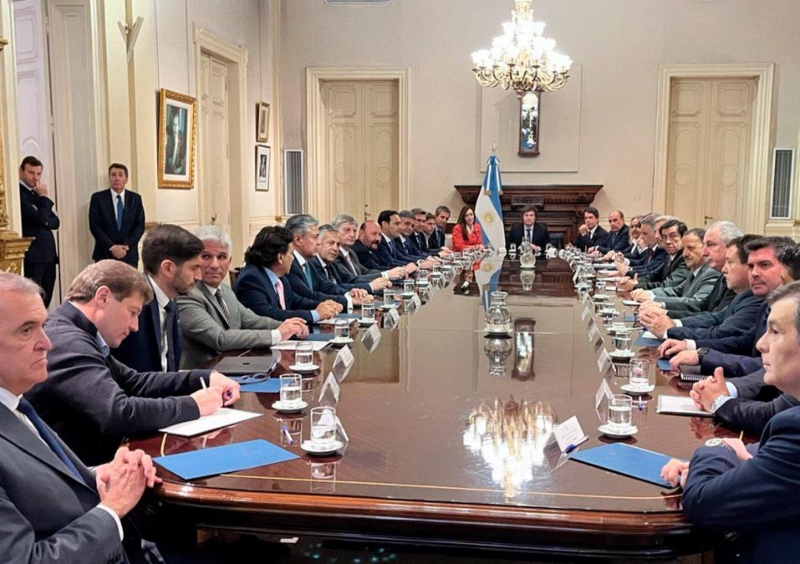 Todos los mandatarios provinciales asisten al encuentro, que se realiza en el Salón Eva Perón. Se espera que el Presidente se refiera a la importancia de que las provincias busquen controlar el déficit fiscal y que explique las medidas que enviará en las próximas horas al Congreso.