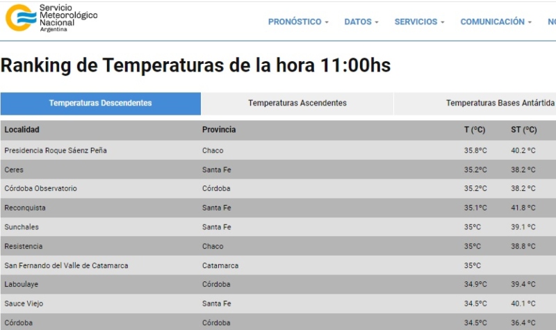 A las 11 de la mañana de este miércoles 7 de febrero, Presidencia Roque Sáenz Peña registraba una temperatura de 35,8º C pero la térmica se ubicaba en 40,2º C siendo la ciudad más calurosa del país. Así se desprende de los datos del Servicio Meteorológico Nacional (SMN) difundido a través de la web oficial.