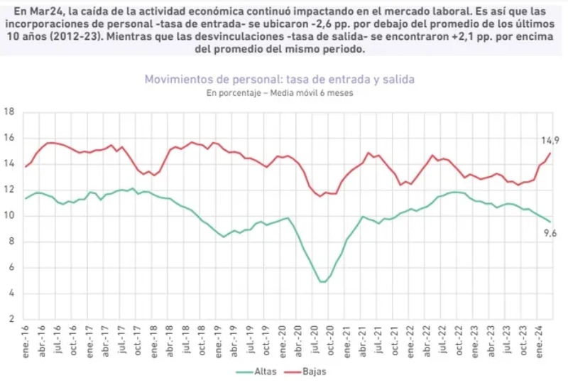 La brecha entre desvinculaciones e incorporaciones de personal alcanzó en marzo de 2024 su peor momento desde 2020, cuando la economía estaba profundamente paralizada por la pandemia de Covid-19. Los recientes despidos y el escaso optimismo respecto del repunte de la actividad económica tuvieron un marcado impacto en el empleo.