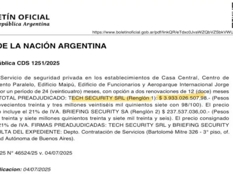 El contrato tiene una duración de 24 meses, pero podría renovarse por dos períodos adicionales, de un año cada uno. La suma total que recibiría Tech Security por sus servicios sería $3.933.026.507,98. Otra firma llamada Briefing Security también fue preseleccionada, pero su presupuesto es considerablemente más bajo: $237.537.036.