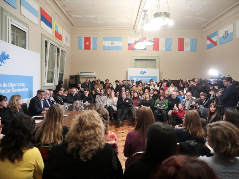 Familiares de las militantes políticas detenidas junto a los abogados brindaron una conferencia de prensa en las oficinas del bloque de diputados de Unión por la Patria.