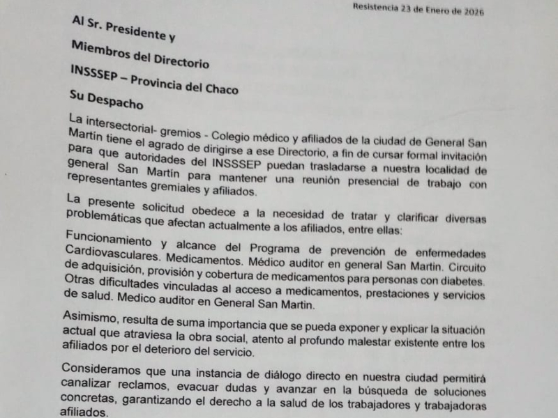 El avance se produce tras pedidos de audiencia a las autoridades de la obra social y una conferencia de prensa realizada por la Multisectorial de General San Martín junto al Colegio Médico local, donde se visibilizó la necesidad urgente de contar con un profesional responsable de auditar prestaciones, ordenar derivaciones y agilizar trámites que afectan directamente el acceso a la salud de los afiliados.