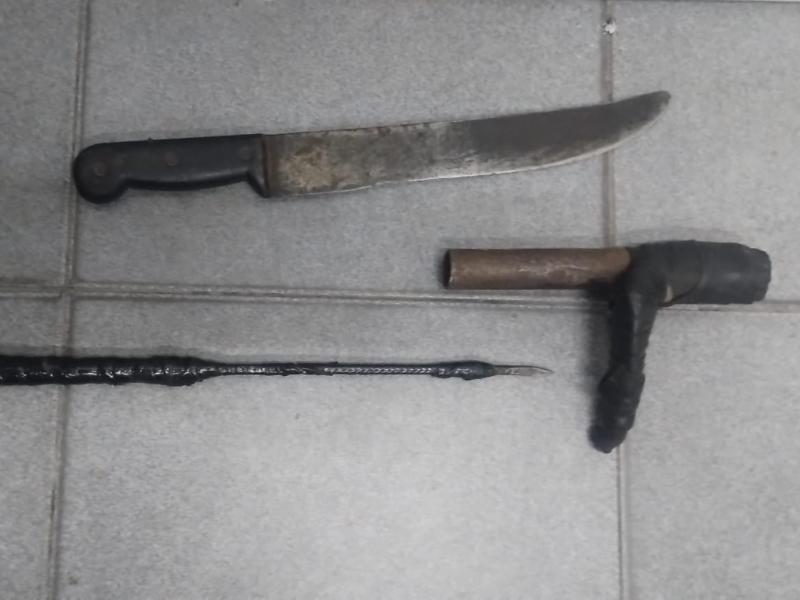 Minutos después, personal del Servicio Externo logró detener a un sujeto de 33 años, quien llevaba entre sus prendas un machete marca Tramontina, un hierro con punta y un tubo con mango, este último aparentemente parte de un arma de fabricación casera tipo “tumbera”.