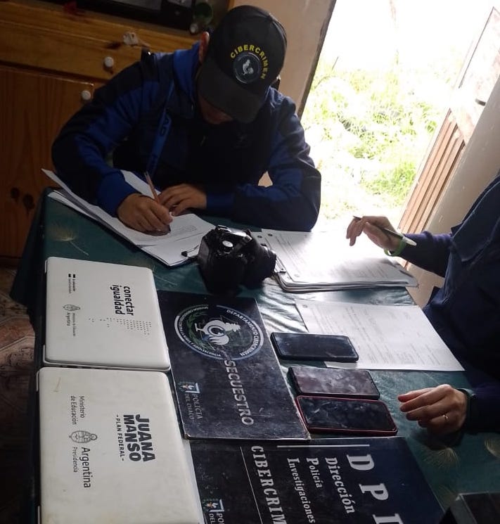 Durante el allanamiento en sus dos viviendas, una ubicada en el barrio Villa Río Negro y la otra en el barrio Carpincho Macho, la policía secuestro varios dispositivos electrónicos, incluyendo dos celulares, tres computadoras, dos cámaras digitales fotográficas, una videocámara digital y un gabinete de PC.