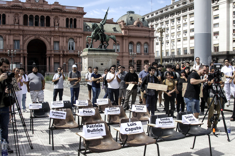 Sobre la plaza, a pocos metros de la entrada a la Casa Rosada, los docentes y estudiantes organizados dispusieron de un pizarrón y unas filas de asientos, a las que le asignaron los nombres de los funcionarios convocados, que resultaron vacíos desde que empezó hasta que culminó la charla. La presidenta de la FUBA, Priscila Vitale, había tomado lista antes de la clase: