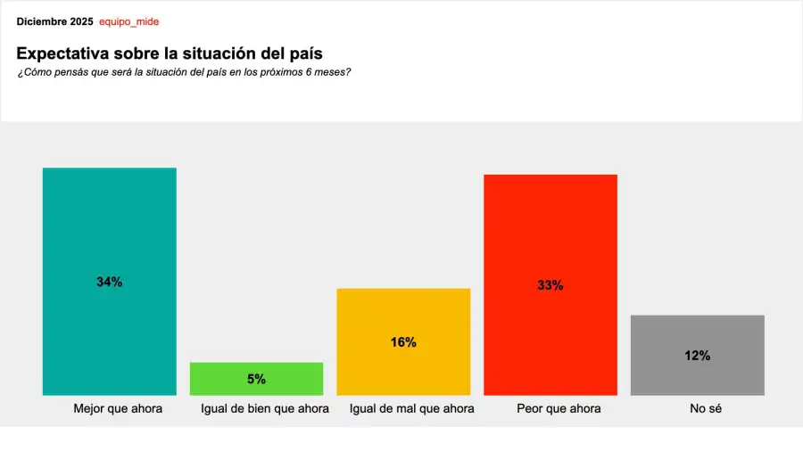 Respecto a las expectativas para los próximos seis meses, el 34% cree que estará “mejor que ahora” y el 33% imagina lo contrario. Un 16% espera seguir “igual de mal que ahora” y sólo un 5% proyecta estar “igual de bien”.