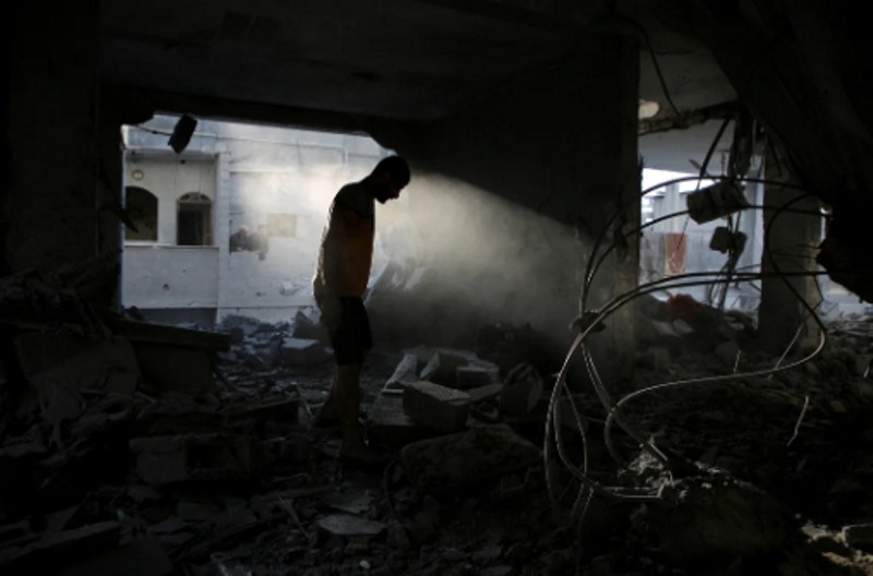 Palestino inspecciona una casa alcanzada por el ataque de Israel.