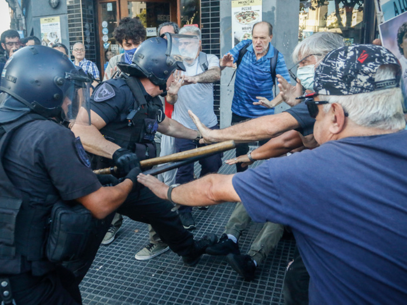 Respecto a la jubilada que recibió un empujón que fue grabado en un video y causó indignación, el texto apenas sostiene que “se observa a una mujer mayor de edad que con un objeto contundente (aparentemente, un palo), golpeaba por detrás reiteradamente a un policía que giró para defenderse de la agresión, y luego esa mujer cayó al suelo”.
