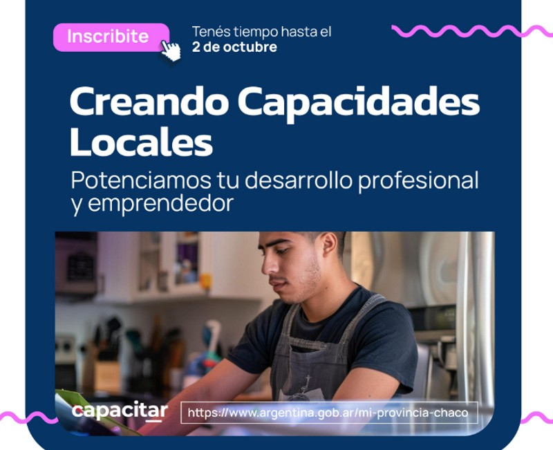 Hasta el próximo miércoles 2 de octubre estará abierta la inscripción para sumarse a la propuesta “Creando capacidades locales”, que impulsan articuladamente Nación y Provincia con el objetivo de potenciar el desarrollo profesional y emprendedor de quienes desarrollan diversas actividades en el sector privado.