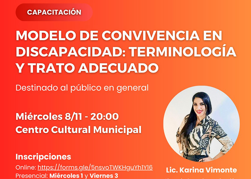 El Municipio a través de la Secretaría de Desarrollo Humano, brindará este martes 7 y miércoles 8 de noviembre una capacitación: Modelo de convivencia en discapacidad: Terminología y trato adecuado, destinado a medios de comunicación, funcionarios municipales y público en general. Las capacitaciones se llevarán a cabo en esta primera jornada destinada a medios de comunicación y funcionarios municipales; en tanto que el día siguiente será para el público en general.