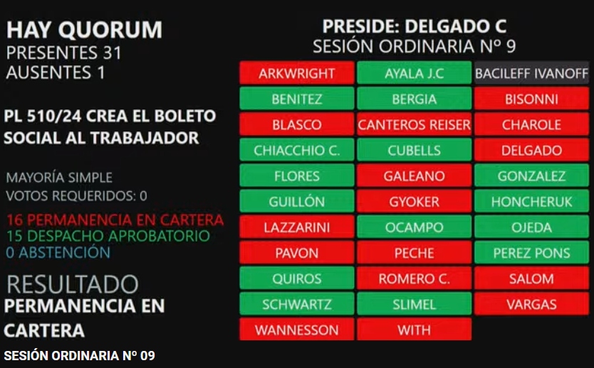 La iniciativa recogió solamente los votos de la oposición que defendió el proyecto en beneficio del sector trabajador para que abone solo el 60% del costo de un pasaje de colectivos y que el 40% restante sea asumido por el Ejecutivo. Nuevamente, la mayoría legislativa, votó para mantenerlo en Comisión hasta tanto los organismos vinculados respondan a los pedidos girados desde las carteras de Hacienda y de Industria donde fue analizado.