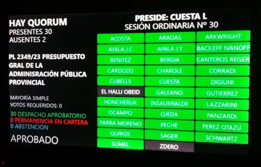 Con 30 votos afirmativos, la totalidad de los diputados presentes en la sesión ordinaria de este miércoles, se sancionó el Presupuesto 2024, que fija la suma de un billón seiscientos siete mil cuatrocientos noventa y seis millones doscientos ochenta y ocho mil trescientos setenta y uno pesos ($1.607.496.288.371) para el total de erogaciones del presupuesto general de la administración pública provincial no financiera (administración central y organismos descentralizados), para el ejercicio 2024.