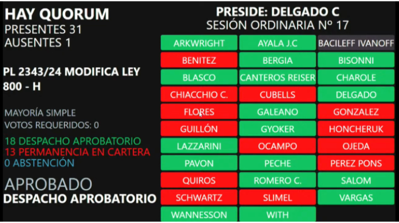 La votación fue de 17 votos a favor y 14 en contra, una mayoría simple. Por la rectificación del diputado justicialista Juan Carlos Ayala que votó a favor erróneamente.