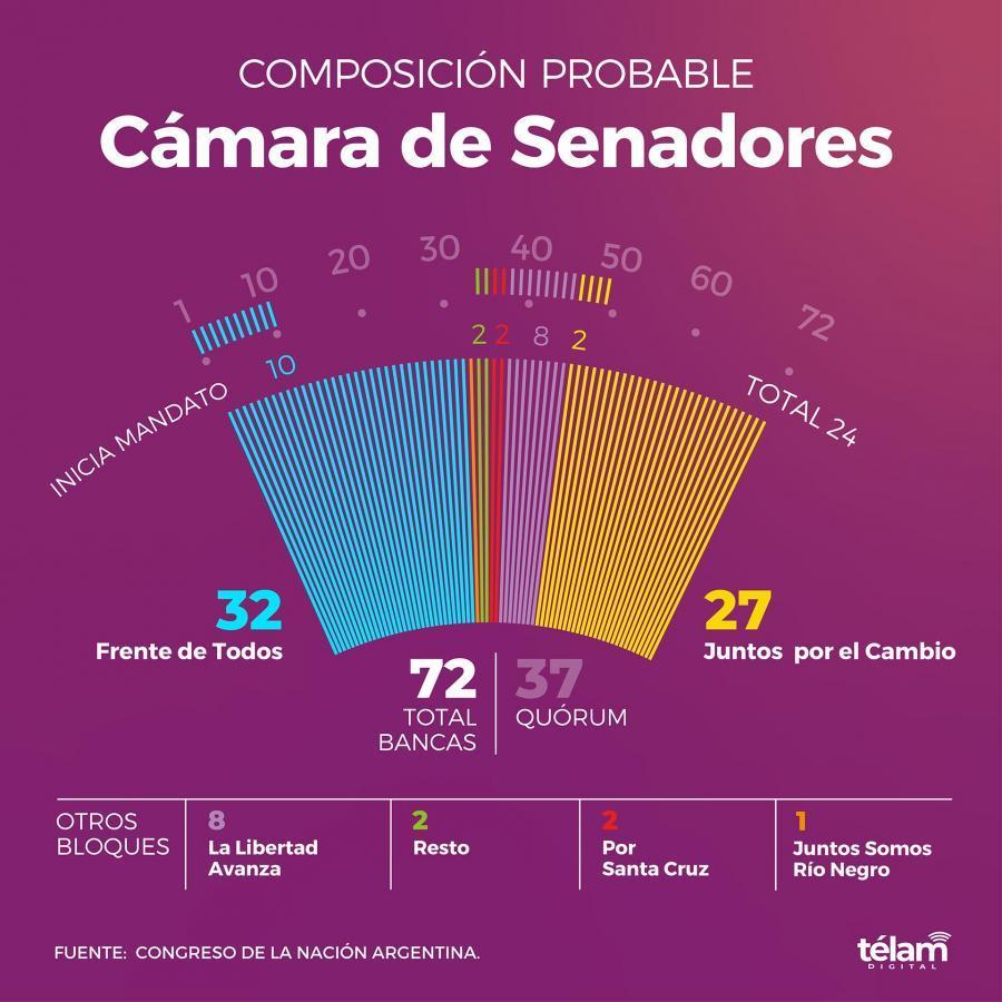 El escenario actual, de virtual parálisis en la Cámara alta, ante la paridad de fuerza entre las dos alianzas mayoritarias, UxP y JxC, se verá modificado a partir del 10 de diciembre próximo, con la nueva mayoría del oficialismo y la aparición de los libertarios de Milei, que no tenían representación hasta el momento y tendrán ocho bancas con el recambio de fin de año.