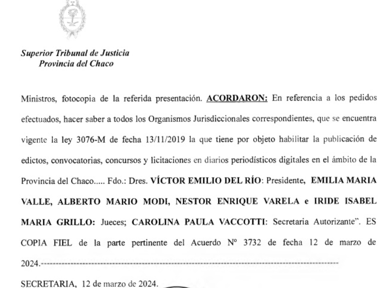 Así, a través del punto 3 del Acuerdo Nº 3732, los jueces Víctor Emilio del Río, Emilia María Valle, Alberto Mario Modi, Néstor Enrique Varela e Iride Isabel María Grillo, definieron “hacer saber a todos los organismos jurisdiccionales correspondientes, que se encuentra vigente la Ley 3076-M de fecha 13/11/2019, la que tiene por objeto habilitar la publicación de edictos, convocatorias, concursos y licitaciones en diarios periodísticos digitales en el ámbito de la provincia del Chaco”.