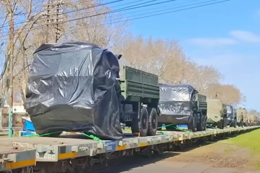 Según el portal Zona Militar, entre los pertrechos transportados se destacan camiones tácticos Oshkosh FMTV M1083, junto a vehículos blindados 4×4 Alvis Tactica y cazacarros SK-105 Kürassier. El tren había partido desde Retiro (Buenos Aires) y tiene como destino la ciudad de Avia Terái (Chaco), donde se desarrollarán prácticas de artillería durante un mes.