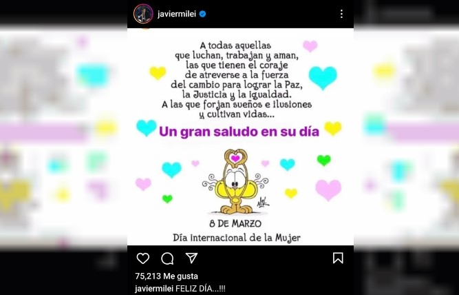 El presidente Javier Milei envió hoy un polémico saludo en el marco del Día Internacional de la Mujer a través de sus redes sociales. Para el mensaje utilizó un imagen del ilustrador Nik Gaturro, alineado con la administración libertaria, y prepara un anuncio controversial respecto al futuro del Salón de las Mujeres de Casa Rosada.