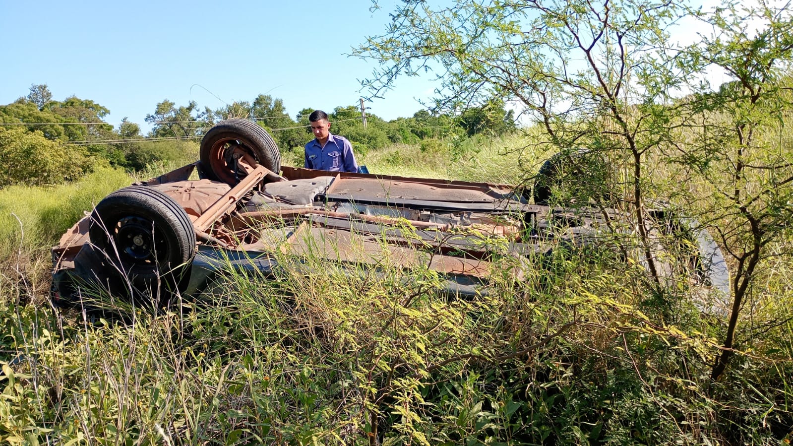 Al llegar, constataron un auto Renault Symbol color gris, volcado a 20 metros de la cinta asfáltica. Había dos personas mayores de edad con lesiones, y una persona dentro del habitáculo.