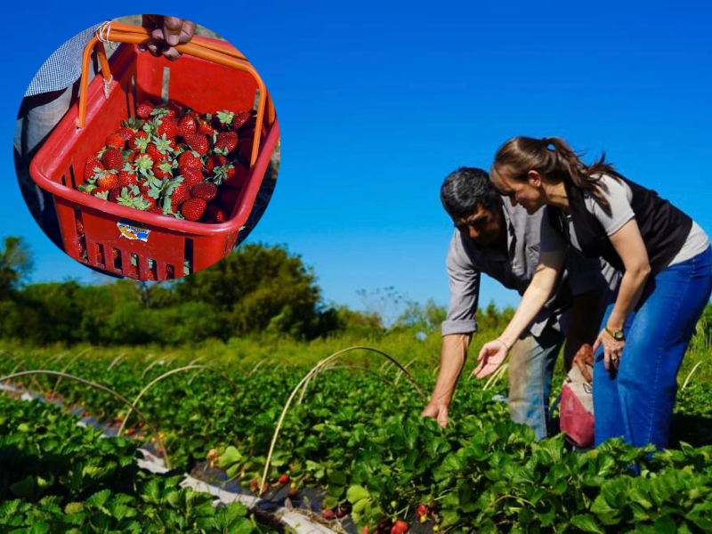 El productor local Faustino Rivas recibió a la vicegobernadora Silvana Schneider en su campo de Las Palmas, donde junto a su esposa llevan adelante un emprendimiento familiar de frutillas que ya cumple su cuarto año. Actualmente producen entre 40 y 45 kilos diarios que se comercializan dentro del pueblo.