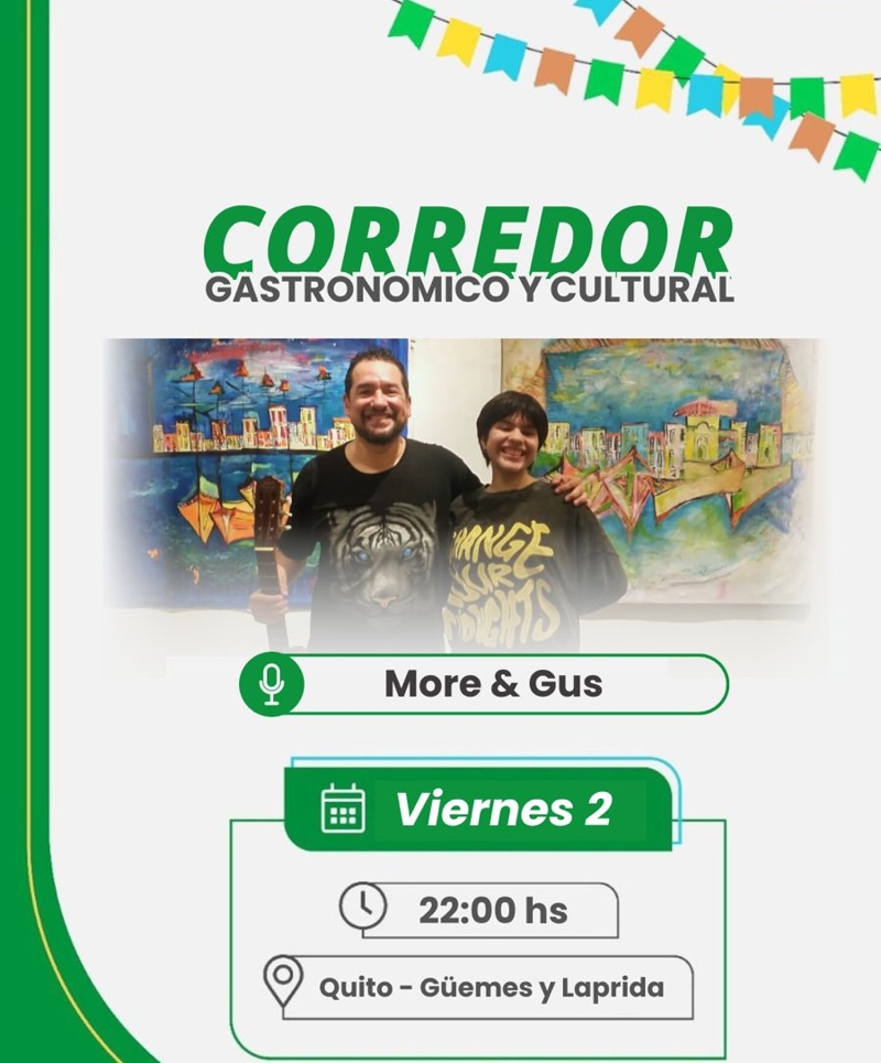 La Secretaría de Cultura y Turismo invita a vecinos a disfrutar de los espectáculos que se llevarán a cabo para acompañar y dar visibilidad a esta iniciativa creando un Corredor Gastronómico y Cultural. El viernes 2 a las 21 horas, en La Biela (Güemes 695), actuará Zamu Caballero, y a las 22 estarán More y Gus, en el bar Quito (Güemes y avenida Laprida).