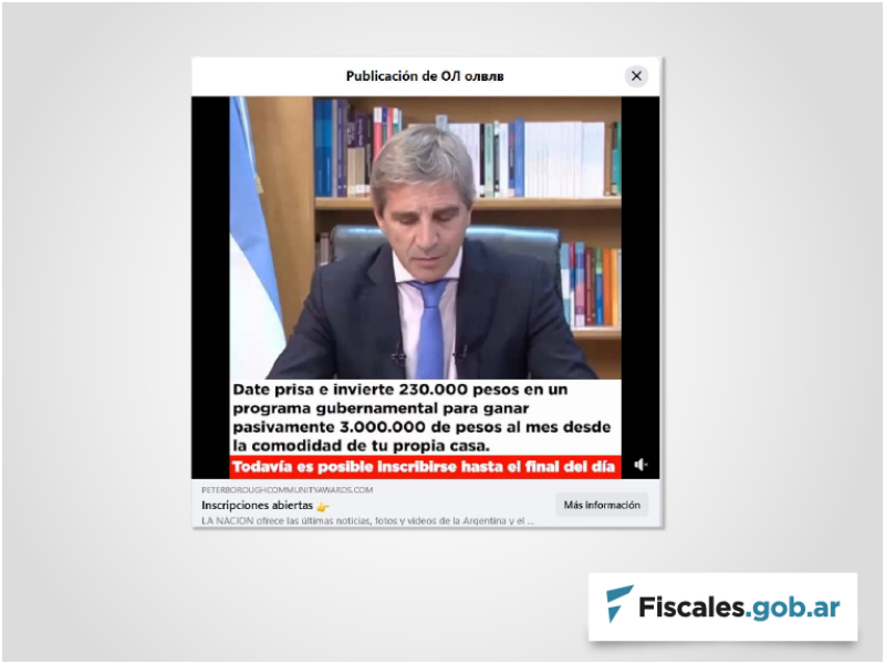 De acuerdo con la denuncia recibida en esa fiscalía, los estafadores se valen de un perfil en la red social Facebook que contiene un video promocional con una falsa declaración del ministro -que presuntamente fue creada con mecanismos de inteligencia artificial- y dos páginas web fraudulentas que simulan ser el sitio oficial del gobierno, Argentina.gob.ar, y una nota periodística realizada al ministro en el diario La Nación.