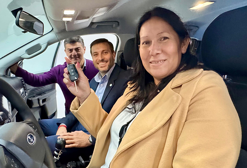 La ganadora recibió las llaves del flamante rodado en manos del presidente de Lotería Chaqueña, Lucas Apud Masín; el vocal oficial Juan Chaussivert y el director de Juegos Especiales, Pablo Espinosa.