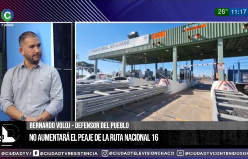 El defensor del Pueblo, Bernardo Voloj, visitó los estudios de CIUDAD TV para dialogar sobre el nuevo aumento dispuesto para los peajes. Aseguró que en el Corredor 3, Makallé y Puente Belgrano están exentos por la acción judicial contra el primero que se dispuso con un salto de $300 a $900, una medida cautelar que salió favorable y que impulsaron junto a la Asociación Consumidores Unidos del Chaco (CUCHA).