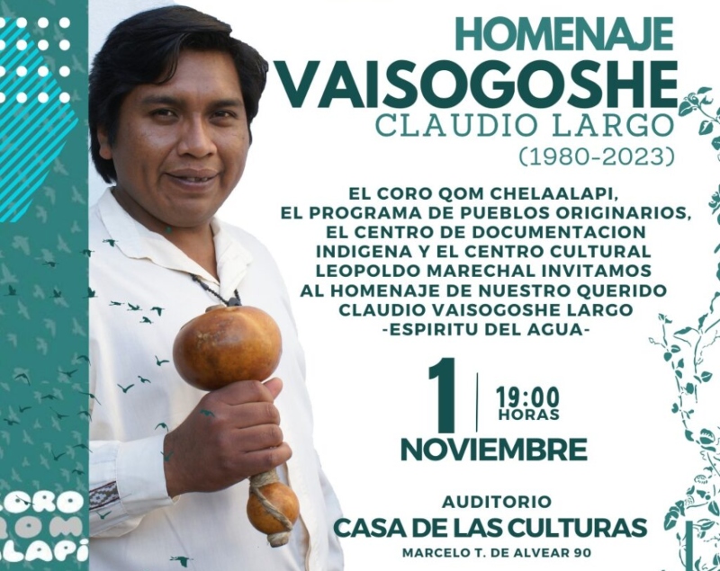 Largo fue director del Coro Qom Chelaalapi. “Vaisogoshe”, su nombre en qom, significa “El espíritu de las aguas”. Durante la jornada se compartirán videos y entrevistas de Vaisogoshe, testimonios de familiares, hermanos y hermanas, amigos y amigas que hayan vivido y compartido con Claudio. Además, el Coro Qom Chelaalapi interpretará algunas canciones y se contará con la participación de otros artistas.