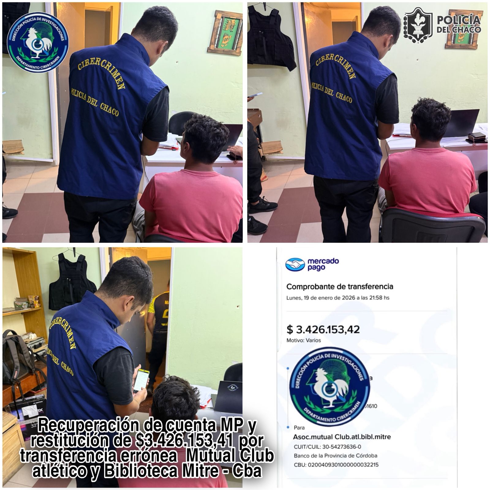 En el marco de una investigación iniciada por una transferencia bancaria electrónica errónea, personal del Departamento Cibercrimen llevó adelante un amplio operativo técnico y de campo que permitió recuperar y restituir una suma superior a los tres millones de pesos a una ciudadana damnificada.