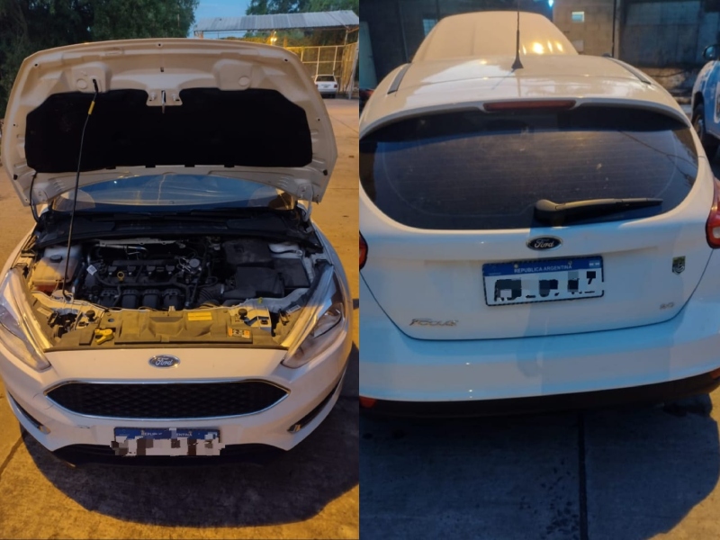 El lunes por la tarde, personal de la Dirección General de Inteligencia Criminal secuestró un Ford Focus blanco que tenía ambos dominios apócrifos, y lo mismo sucedía con la numeración del motor y chasis.