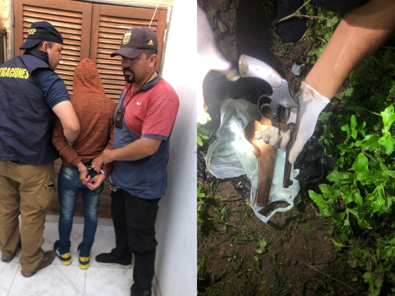 Otro grupo de trabajo se dirigió a un camino vecinal del Pueblo Viejo donde hallaron un revólver calibre 38 largo de 6 alvéolos, utilizado en el hecho.