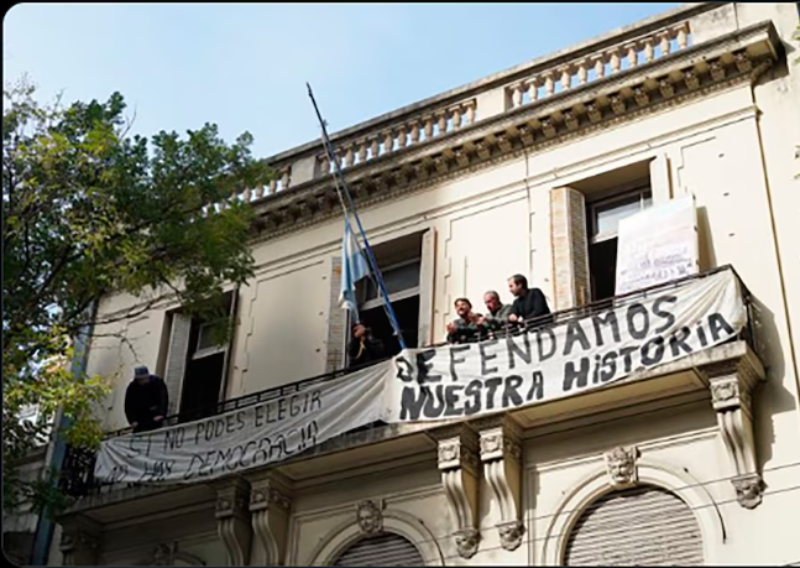 Alrededor de 50 personas ingresaron alrededor de las 14 en la sede del edificio público. Además de Grabois, en el grupo estaban presentes los diputados nacionales de Unión por la Patria, Itai Hagman y Natalia Zaracho, el senador bonaerense Federico Fagioli y la diputada provincial Lucía Klug, que forman parte del Frente Patria Grande. Desde los balcones, los militantes colgaron una bandera con las consignas “Si no podés elegir, no hay democracia” y “Defendamos nuestra historia”.