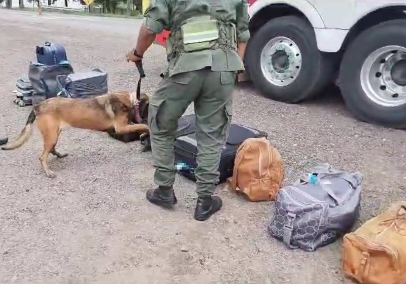 Al momento del registro de la bodega del ómnibus, los funcionarios contaron con la asistencia del can detector de narcóticos “Olivia”, el cual marcó la presencia de estupefacientes al pasar por una valija y por un carro de compras, por lo que los gendarmes procedieron a identificar a los propietarios (se trataba de un hombre y una mujer mayores de edad) de los mismos.
