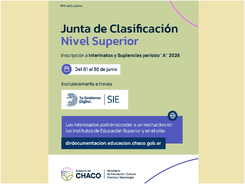 El Ministerio de Educación, a través de la Junta de Clasificación de Nivel Superior, comunica a los Institutos de Educación Superior (IES) de la provincia del Chaco y a los docentes interesados que del 1 al 30 de junio, inclusive, se encuentra habilitada la inscripción para Interinatos y Suplencias correspondiente al Período “A” del ciclo lectivo 2026.