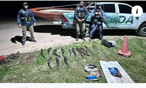 Durante el operativo, los efectivos procedieron al secuestro de varios ejemplares de peces, entre ellos patíes, además de mallas y redes de distintos tamaños, junto con un bote.