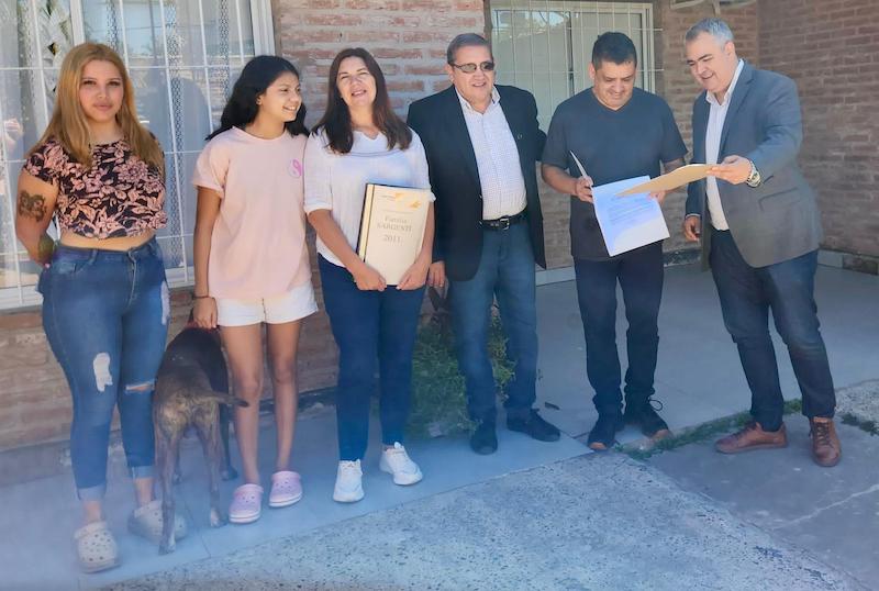 Adolfo Sargenti, junto a su familia, recibió por parte de los vocales Daniel Monti y Diego Gutiérrez los documentos otorgados por el Instituto Provincial de Desarrollo Urbano y Vivienda (IPDUV).