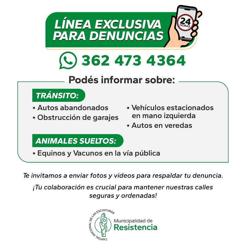 El Municipio de Resistencia convocó a los contribuyentes a comunicarse con la línea 3624734364, activa para denunciar por casos de infracciones de Tránsito y que ahora también atenderá reclamos por animales sueltos en la vía pública.