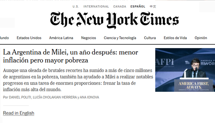 El extenso artículo titulado "La Argentina de Milei, un año después: menor inflación por mayor pobreza" publicado por el New York Times analiza las luces y sombras del primer aniversario del gobierno de La Libertad Avanza. El artículo de la prestigiosa publicación estadounidense analiza los logros en materia de control de la inflación y, por otro lado, el aumento de la pobreza.