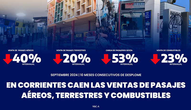Al cierre del tercer trimestre de 2024, los datos muestran bruscas caídas en la venta de Pasaje Aéreos y Pasajes Terrestres, desde la Capital correntina con destinos internos y nacionales.