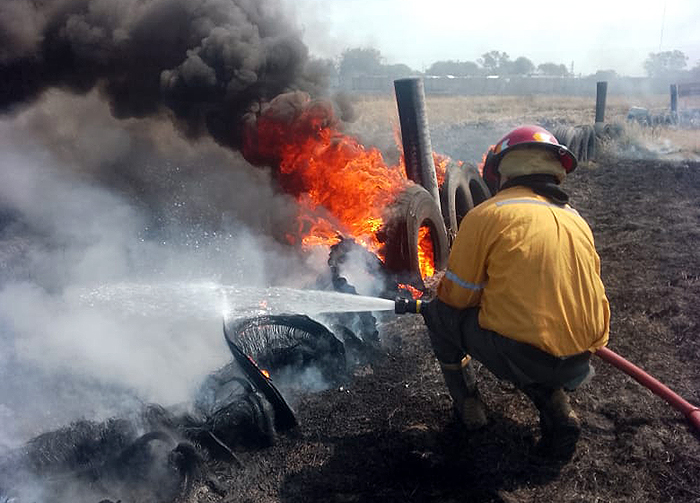 El personal de la División Bomberos de Gral. San Martín intervino en un incendio que ocurrió en la Ruta 90, acceso Sur a la ciudad, en el predio del circuito de carreras de motos. El siniestro afectó un área de aproximadamente 5 hectáreas de pastos secos y 100 metros lineales de cubiertas en desuso.