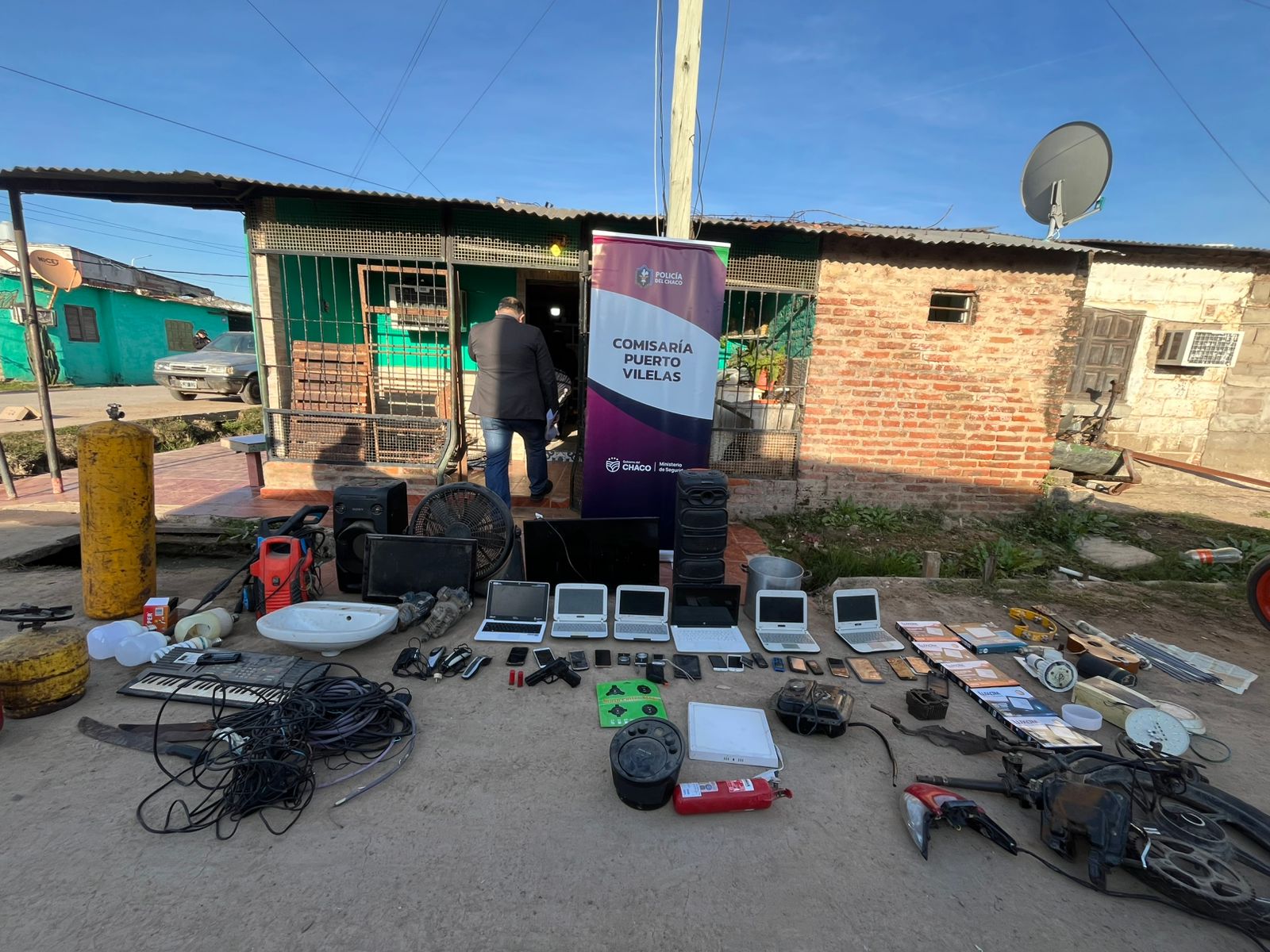 En el primer domicilio, secuestraron dos cartuchos calibre 12/70, uno calibre 22, una réplica de arma de fuego con su respectivo cargador, cinco netbook de gobierno, una notebook, cuatro máquinas de cortar cabello, dos hidrolavadoras, dos parlantes musicales, dos televisores, dos bombas presurizadoras, tres cámaras digitales, doce teléfonos celulares, dos tablets, seis reflectores, cuatro focos de alumbrado público, un ventilador de pie, una olla de aluminio de 20 litros, un órgano musical marca Yamaha, dos piletas de cerámica, motopartes, once tarjetas de débito, ocho cedulas de motocicletas, siete documentos de identidad, tres machetes, tres tubos de gas, y $1.035.700 discriminados en varios billetes.